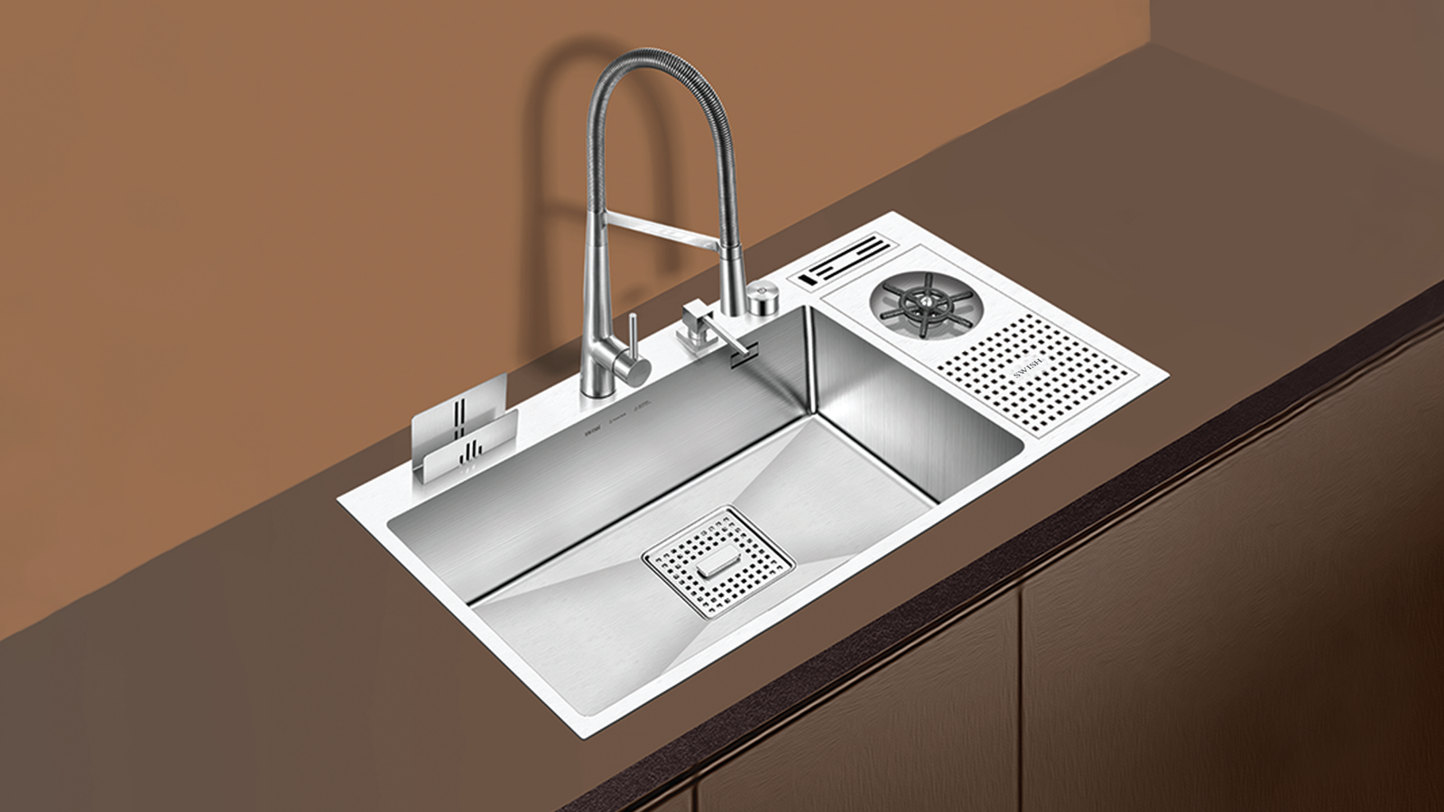 SWISH multifunctional sinks feature organised drip trays and splash-proof designs that keep surrounding counters clean and dry during washing.